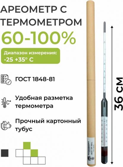 - Ареометр - Спиртометр с Термометром АСП-Т 60-100% ГОСТ 18481-81