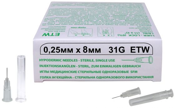 Игла инъекционная стерильная 31G (0,25*8 мм), 100 шт/упак предназначена для процедур, требующих точности и минимальной инвазивности, что позволяет использовать иглу для подкожных и внутрикожных инъекций.