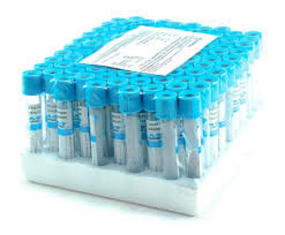 Вакуумные пробирки для коагулологических исследований с цитратом натрия - используются при исследованиях систем гемостаза; коагуляционных свойств крови: протромбин, тромбопластин, фибриноген, факторы свертывания. Пробирки заполнены буферным раствором цитрата натрия, представленного в двух концентрациях - 0.109 моль/л. (3.2%) или 0.129 моль/л (3.8%). Выбор концентрации зависит от принятой практики лаборатории. Цитрат натрия является антикоагулянтом для сбора венозной крови с целью проведения исследований коагуляционных свойств крови. Одна часть буфера цитрата натрия смешивается с девятью частями крови (соотношение к количеству забираемой крови 1/9), pH крови остается в пределах 7.1-7.35 (важно для протромбиновых параметров). При взятии проб крови в несколько пробирок у одного пациента пробирка с цитратом должна заполняться до пробирки с активатором свертывания. Очень важно соблюдать правильное соотношение кровь антикоагулянт в пробе с цитратом. Недостаток цитрата в пробе ведет к образованию микросгустков и/или коагуляции пробы, а избыток цитрата — к искажению результатов анализа за счет связывания кальция из реагентов. Сразу после взятия образца пробирку с цитратом необходимо аккуратного перемешать не менее 5 раз для предотвращения образования микросгустков.