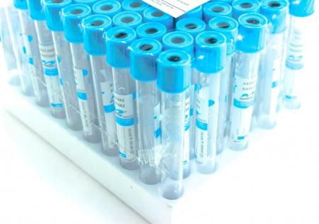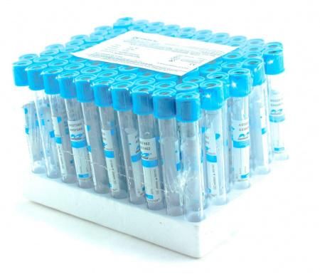 Вакуумные пробирки для коагулологических исследований с цитратом натрия -  используются при исследованиях систем гемостаза; коагуляционных свойств крови: протромбин, тромбопластин, фибриноген, факторы свертывания. Пробирки заполнены буферным раствором цитрата натрия, представленного в двух концентрациях - 0.109 моль/л. (3.2%) или 0.1129 моль/л (3.8%). Выбор концентрации зависит от принятой практики лаборатории. Цитрат натрия является антикоагулянтом для сбора венозной крови с целью проведения исследований коагуляционных свойств крови. Одна часть буфера цитрата натрия смешивается с девятью частями крови (соотношение к количеству забираемой крови 1/9), pH крови остается в пределах 7.1-7.35 (важно для протромбиновых параметров). При взятии проб крови в несколько пробирок у одного пациента пробирка с цитратом должна заполняться до пробирки с активатором свертывания. Очень важно соблюдать правильное соотношение кровь антикоагулянт в пробе с цитратом. Недостаток цитрата в пробе ведет к образованию микросгустков и/или коагуляции пробы, а избыток цитрата — к искажению результатов анализа за счет связывания кальция из реагентов. Сразу после взятия образца пробирку с цитратом необходимо аккуратного перемешать не менее 5 раз для предотвращения образования микросгустков.