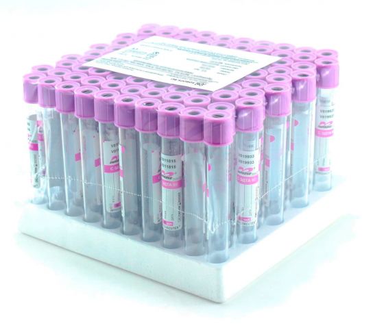 Вакуумные пробирки для гематологических исследований с ЭДТА - К3 (Этилендиаминтетраацетат) - используются для исследования цельной крови в гематологии – подсчете клеток крови, определении СОЭ и пр., ПЦР исследованиях (качественные и количественные методики), иммунохимии, генодиагностике. Антикоагулянт - этилендиаминтетраацетат (ЭДТА) и его щелочные соли способны создавать хелатные соединения с ионами кальция с образованием растворимых высокостабильных комплексов, тем самым предотвращая свертывание крови, при этом концентрация и характеристики клеточных и внеклеточных компонентов остаются практически неизменными. Наиболее эффективная концентрация ЭДТА – 1,2 мг/мл крови. Внутренние стенки пробирки покрыты сухой либо жидкой солью ЭДТА-К3  в концентрации 1,2 – 2,0 мг  (0,00411 моль/л – 0,006843 моль/л) ЭДТА на 1 мл крови. Пробирки можно использовать для отбора проб непосредственно в анализаторе без необходимости их вскрытия. Эритроциты, лейкоциты и тромбоциты стабильны в крови с ЭДТА до 24 часов. Мазок крови необходимо сделать в течение 3 часов после взятия крови. Пробирки с ЭДТА-К3 можно использовать для  иммуногематологического анализа, например определения групп крови, резус-фактора и скрининга антител, а также для определения вирусных маркеров в скрининговых лабораториях. Основное отличие соли ЭДТА-К2 от ЭДТА-К3 в том, что ЭДТА-К3 показывает меньшую способность поддержания крови в жидком состоянии, также ЭДТА-К3 влияет на подсчет лейкоцитов, занижая их количество. Наиболее широко используются пробирки, содержащие 1,95 мг ЭДТА/1мл крови.