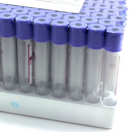 Вакуумные пробирки для гематологических исследований с ЭДТА-К3 (Этилендиаминтетраацетат) - используются для исследования цельной крови в гематологии – подсчете клеток крови, определении СОЭ и пр., ПЦР исследованиях (качественные и количественные методики), иммунохимии, генодиагностике. Антикоагулянт - этилендиаминтетраацетат (ЭДТА) и его щелочные соли способны создавать хелатные соединения с ионами кальция с образованием растворимых высокостабильных комплексов, тем самым предотвращая свертывание крови, при этом концентрация и характеристики клеточных и внеклеточных компонентов остаются практически неизменными. Наиболее эффективная концентрация ЭДТА – 1,2 мг/мл крови. Внутренние стенки пробирки покрыты сухой либо жидкой солью ЭДТА-К3 в концентрации 1,2 – 2,0 мг (0,00411 моль/л – 0,006843 моль/л) ЭДТА на 1 мл крови. Пробирки можно использовать для отбора проб непосредственно в анализаторе без необходимости их вскрытия. Эритроциты, лейкоциты и тромбоциты стабильны в крови с ЭДТА до 24 часов. Мазок крови необходимо сделать в течение 3 часов после взятия крови. Пробирки с ЭДТА-К3 можно использовать для иммуногематологического анализа, например определения групп крови, резус-фактора и скрининга антител, а также для определения вирусных маркеров в скрининговых лабораториях. Основное отличие соли ЭДТА-К2 от ЭДТА-К3 в том, что ЭДТА-К3 показывает меньшую способность поддержания крови в жидком состоянии, также ЭДТА-К3 влияет на подсчет лейкоцитов, занижая их количество. Наиболее широко используются пробирки, содержащие 1,95 мг ЭДТА/1мл крови.