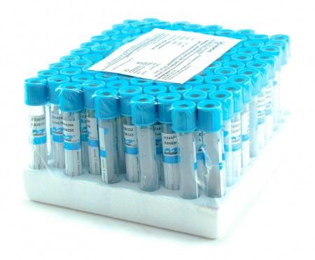 Вакуумные пробирки для коагулологических исследований с цитратом натрия -  используются при исследованиях систем гемостаза; коагуляционных свойств крови: протромбин, тромбопластин, фибриноген, факторы свертывания. Пробирки заполнены буферным раствором цитрата натрия, представленного в двух концентрациях - 0.109 моль/л. (3.2%) или 0.1129 моль/л (3.8%). Выбор концентрации зависит от принятой практики лаборатории. Цитрат натрия является антикоагулянтом для сбора венозной крови с целью проведения исследований коагуляционных свойств крови. Одна часть буфера цитрата натрия смешивается с девятью частями крови (соотношение к количеству забираемой крови 1/9), pH крови остается в пределах 7.1-7.35 (важно для протромбиновых параметров). При взятии проб крови в несколько пробирок у одного пациента пробирка с цитратом должна заполняться до пробирки с активатором свертывания. Очень важно соблюдать правильное соотношение кровь антикоагулянт в пробе с цитратом. Недостаток цитрата в пробе ведет к образованию микросгустков и/или коагуляции пробы, а избыток цитрата — к искажению результатов анализа за счет связывания кальция из реагентов. Сразу после взятия образца пробирку с цитратом необходимо аккуратного перемешать не менее 5 раз для предотвращения образования микросгустков.