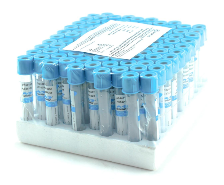 Вакуумные пробирки для коагулологических исследований с цитратом натрия - используются при исследованиях систем гемостаза; коагуляционных свойств крови: протромбин, тромбопластин, фибриноген, факторы свертывания. Пробирки заполнены буферным раствором цитрата натрия, представленного в двух концентрациях - 0.109 моль/л. (3.2%) или 0.1129 моль/л (3.8%). Выбор концентрации зависит от принятой практики лаборатории. Цитрат натрия является антикоагулянтом для сбора венозной крови с целью проведения исследований коагуляционных свойств крови. Одна часть буфера цитрата натрия смешивается с девятью частями крови (соотношение к количеству забираемой крови 1/9), pH крови остается в пределах 7.1-7.35 (важно для протромбиновых параметров). При взятии проб крови в несколько пробирок у одного пациента пробирка с цитратом должна заполняться до пробирки с активатором свертывания. Очень важно соблюдать правильное соотношение кровь антикоагулянт в пробе с цитратом. Недостаток цитрата в пробе ведет к образованию микросгустков и/или коагуляции пробы, а избыток цитрата — к искажению результатов анализа за счет связывания кальция из реагентов. Сразу после взятия образца пробирку с цитратом необходимо аккуратного перемешать не менее 5 раз для предотвращения образования микросгустков.