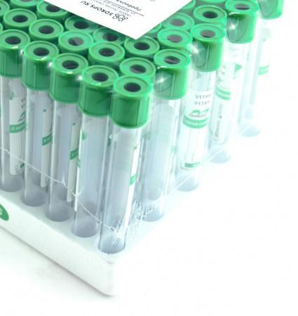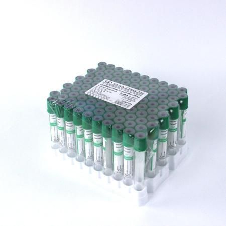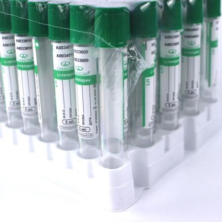 Вакуумные пробирки для исследования плазмы с литий-гепарином - широко используемые в практике клинико-диагностических лабораторий при исследованиях биохимических показателей и показателей клеточного иммунитета пробирки. Антикоагулянт (литий-гепарин) в сухом виде нанесен на внутреннюю стенку пробирки. Основное действие гепарина — блокирование активности тромбина и, следовательно, торможение перехода растворимого фибриногена в нерастворимый фибрин, при смешивании с забранным материалом гепарин активирует антитромбины и таким образом блокирует каскад свертывания крови. Последующее центрифугирование разделяет кровь на плазму и сгусток форменных элементов. Основное преимущество использования гепаринизировнной плазмы перед сывороткой заключается в сокращении времени на проведение анализа, поскольку в случае плазмы не нужно выжидать время полного свертывания крови, а также гораздо более низкий риск возникновения гемолиза и тромбоцитоза в отобранном образце . Пробирки с гепарином рекомендуется использовать в лабораториях с большим ежедневным потоком биохимических или иммунологических анализов. Гепаринизированную плазму обычно используют для биохимического и иммунологического анализа.