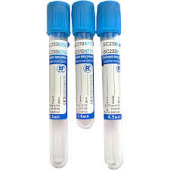 Вакуумные пробирки для коагулологических исследований с цитратом натрия - используются при исследованиях систем гемостаза; коагуляционных свойств крови: протромбин, тромбопластин, фибриноген, факторы свертывания. Пробирки заполнены буферным раствором цитрата натрия, представленного в двух концентрациях - 0.109 моль/л. (3.2%) или 0.129 моль/л (3.8%). Выбор концентрации зависит от принятой практики лаборатории. Цитрат натрия является антикоагулянтом для сбора венозной крови с целью проведения исследований коагуляционных свойств крови. Одна часть буфера цитрата натрия смешивается с девятью частями крови (соотношение к количеству забираемой крови 1/9), pH крови остается в пределах 7.1-7.35 (важно для протромбиновых параметров). При взятии проб крови в несколько пробирок у одного пациента пробирка с цитратом должна заполняться до пробирки с активатором свертывания. Очень важно соблюдать правильное соотношение кровь антикоагулянт в пробе с цитратом. Недостаток цитрата в пробе ведет к образованию микросгустков и/или коагуляции пробы, а избыток цитрата — к искажению результатов анализа за счет связывания кальция из реагентов. Сразу после взятия образца пробирку с цитратом необходимо аккуратного перемешать не менее 5 раз для предотвращения образования микросгустков.