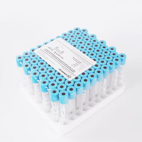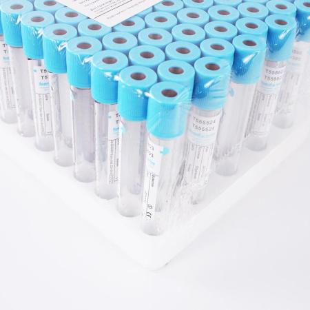 Вакуумные пробирки для коагулологических исследований с цитратом натрия -  используются при исследованиях систем гемостаза; коагуляционных свойств крови: протромбин, тромбопластин, фибриноген, факторы свертывания. Пробирки заполнены буферным раствором цитрата натрия, представленного в двух концентрациях - 0.109 моль/л. (3.2%) или 0.1129 моль/л (3.8%). Выбор концентрации зависит от принятой практики лаборатории. Цитрат натрия является антикоагулянтом для сбора венозной крови с целью проведения исследований коагуляционных свойств крови. Одна часть буфера цитрата натрия смешивается с девятью частями крови (соотношение к количеству забираемой крови 1/9), pH крови остается в пределах 7.1-7.35 (важно для протромбиновых параметров). При взятии проб крови в несколько пробирок у одного пациента пробирка с цитратом должна заполняться до пробирки с активатором свертывания. Очень важно соблюдать правильное соотношение кровь антикоагулянт в пробе с цитратом. Недостаток цитрата в пробе ведет к образованию микросгустков и/или коагуляции пробы, а избыток цитрата — к искажению результатов анализа за счет связывания кальция из реагентов. Сразу после взятия образца пробирку с цитратом необходимо аккуратного перемешать не менее 5 раз для предотвращения образования микросгустков.