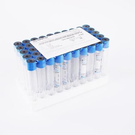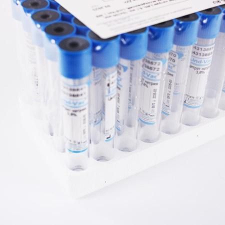 Вакуумные пробирки для коагулологических исследований с цитратом натрия -  используются при исследованиях систем гемостаза; коагуляционных свойств крови: протромбин, тромбопластин, фибриноген, факторы свертывания. Пробирки заполнены буферным раствором цитрата натрия, представленного в двух концентрациях - 0.109 моль/л. (3.2%) или 0.129 моль/л (3.8%). Выбор концентрации зависит от принятой практики лаборатории. Цитрат натрия является антикоагулянтом для сбора венозной крови с целью проведения исследований коагуляционных свойств крови. Одна часть буфера цитрата натрия смешивается с девятью частями крови (соотношение к количеству забираемой крови 1/9), pH крови остается в пределах 7.1-7.35 (важно для протромбиновых параметров). При взятии проб крови в несколько пробирок у одного пациента пробирка с цитратом должна заполняться до пробирки с активатором свертывания. Очень важно соблюдать правильное соотношение кровь антикоагулянт в пробе с цитратом. Недостаток цитрата в пробе ведет к образованию микросгустков и/или коагуляции пробы, а избыток цитрата — к искажению результатов анализа за счет связывания кальция из реагентов. Сразу после взятия образца пробирку с цитратом необходимо аккуратного перемешать не менее 5 раз для предотвращения образования микросгустков.