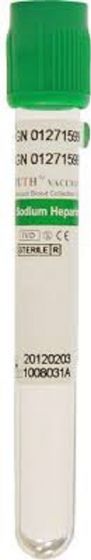 Вакуумные пробирки для исследования плазмы с литий-гепарином - широко используемые в практике клинико-диагностических лабораторий при исследованиях биохимических показателей и показателей клеточного иммунитета пробирки. Антикоагулянт (литий-гепарин) в сухом виде нанесен на внутреннюю стенку пробирки. Основное действие гепарина — блокирование активности тромбина и, следовательно, торможение перехода растворимого фибриногена в нерастворимый фибрин, при смешивании с забранным материалом гепарин активирует антитромбины и таким образом блокирует каскад свертывания крови. Последующее центрифугирование разделяет кровь на плазму и сгусток форменных элементов. Основное преимущество использования гепаринизировнной плазмы перед сывороткой заключается в сокращении времени на проведение анализа, поскольку в случае плазмы не нужно выжидать время полного свертывания крови, а также гораздо более низкий риск возникновения гемолиза и тромбоцитоза в отобранном образце . Пробирки с гепарином рекомендуется использовать в лабораториях с большим ежедневным потоком биохимических или иммунологических анализов. Гепаринизированную плазму обычно используют для биохимического и иммунологического анализа.