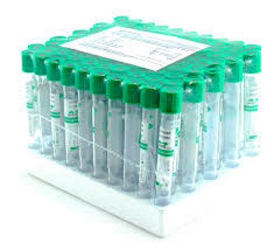 Вакуумные пробирки для исследования плазмы с натрий-гепарином - широко используемые в практике клинико-диагностических лабораторий при исследованиях биохимических показателей и показателей клеточного иммунитета пробирки. Антикоагулянт (натрий-гепарин) в сухом виде нанесен на внутреннюю стенку пробирки. Основное действие гепарина — блокирование активности тромбина и, следовательно, торможение перехода растворимого фибриногена в нерастворимый фибрин, при смешивании с забранным материалом гепарин активирует антитромбины и таким образом блокирует каскад свертывания крови. Последующее центрифугирование разделяет кровь на плазму и сгусток форменных элементов. Основное преимущество использования гепаринизировнной плазмы перед сывороткой заключается в сокращении времени на проведение анализа, поскольку в случае плазмы не нужно выжидать время полного свертывания крови, а также гораздо более низкий риск возникновения гемолиза и тромбоцитоза в отобранном образце . Пробирки с гепарином рекомендуется использовать в лабораториях с большим ежедневным потоком биохимических или иммунологических анализов. Гепаринизированную плазму обычно используют для биохимического и иммунологического анализа.