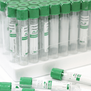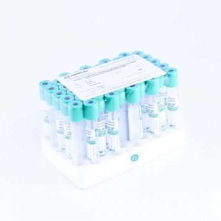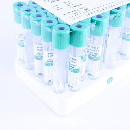 Вакуумные пробирки для исследования плазмы с натрий-гепарином и разделительным гелем - широко применяемые при исследованиях плазмы в клинической химии и иммунологии (витамины, гормоны, иммунный статус), а также иногда используемые в косметологии и стоматологии пробирки. Основное действие гепарина — блокирование активности тромбина и, следовательно, торможение перехода растворимого фибриногена в нерастворимый фибрин, при смешивании с забранным материалом гепарин активирует антитромбины и таким образом блокирует каскад свертывания крови. Для более чистого разграничения плазмы крови и сгустка в пробирке дополнительно содержится специальный инертный олефиновый гель, который представляет собой тиксотропный кополимер, который тяжелее плазмы, но легче форменных клеток крови, поэтому после центрифугирования гель в виде тонкой полоски занимает промежуточное положение и служит разделительным барьером. Преимуществом таких пробирок является больший выход плазмы и ее дальнейшее удобное использование. При необходимости полностью отделенную гелем плазму можно перелить во вторичную пробирку. Основное преимущество использования гепаринизировнной плазмы перед сывороткой заключается в сокращении времени на проведение анализа, поскольку в случае плазмы не нужно выжидать время полного свертывания крови, а также гораздо более низкий риск возникновения гемолиза и тромбоцитоза в отобранном образце.