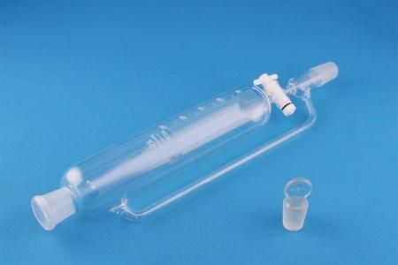 Воронка капельная цилиндрическая, ВД-2-250 шлиф 24/29, с компенсатором давления, на 250 мл. Воронка капельная применяется для разделения жидких несмешивающихся веществ разной плотности, она используются если необходимо достаточно медленно ввести жидкость на дно каких-либо сосудов. Ее часто применяют если ведётся работа с малыми дозами веществ. Изготовлена из стекла способного переносить воздействие большинства химических соединений, включая кислоты и неконцентрированные щелочи. Благодаря наличии компенсатора давления вы сможете добавлять различные жидкости в очень плотно закрытые ёмкости. Компенсатор давления представляет собой трубку, расположенную в боковой части воронки. Предназначена для для сброса избыточного газа из колбы после слива в нее нижней более тяжелой жидкости, когда следует изолировать ее от воздействия воздуха. Капельные воронки бывают грушевидной или цилиндрической формы.